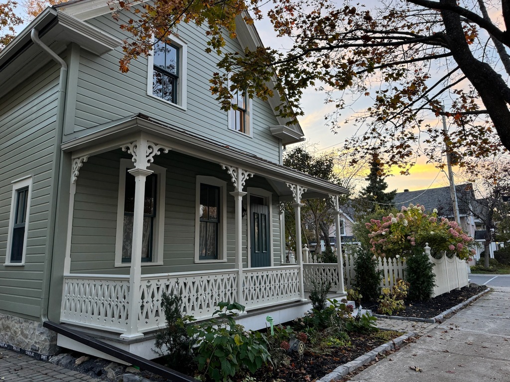 The clapboard siding was repaired and repainted in a heritage palette of sage-green walls, cream trim, and blue-green doors and windows. Modern fencing gave way to a Gothic picket design, and the asphalt paving was replaced with permeable cobblestone, softening the approach and allowing the ground to breathe.