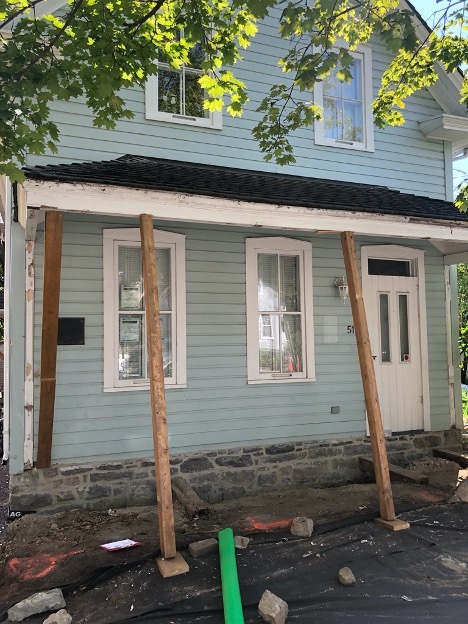 The roofs were replaced with western red-cedar shingles, the stone foundation rebuilt, and the front porch — with its pierced balustrade and chamfered posts — reconstructed in heritage pine. The front door and original windows were restored, while six new wood replicas replaced later PVC units, reinstating the façade’s 19th-century rhythm.